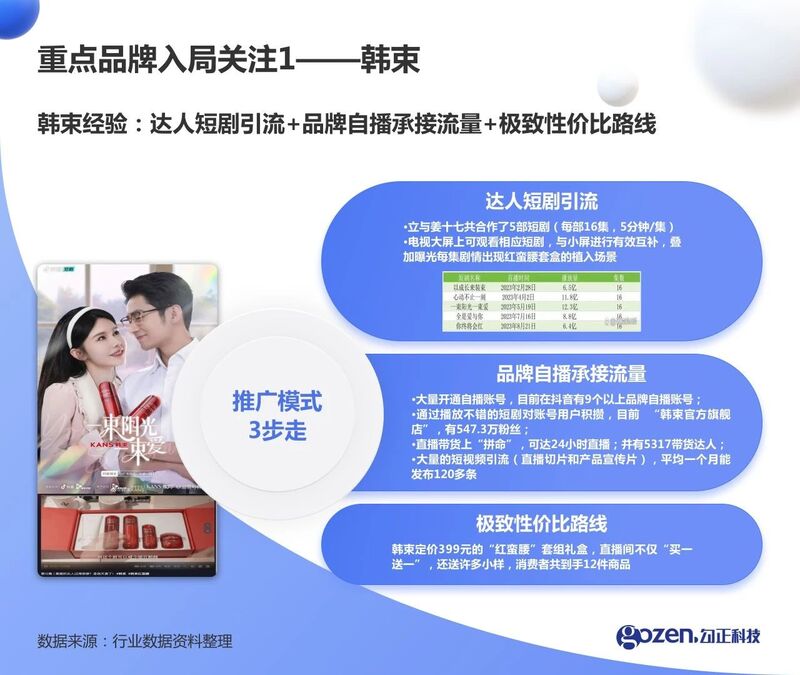 化妆品品牌韩束与姜十七共合作了5部微短剧。采用“达人微短剧引流+品牌自播承接流量+极致性价比”路线。韩束自今年2月以来,已在抖音平台连续7个月取得3位数增长;9月获得近2.9亿元的GMV(位列TOP1)。