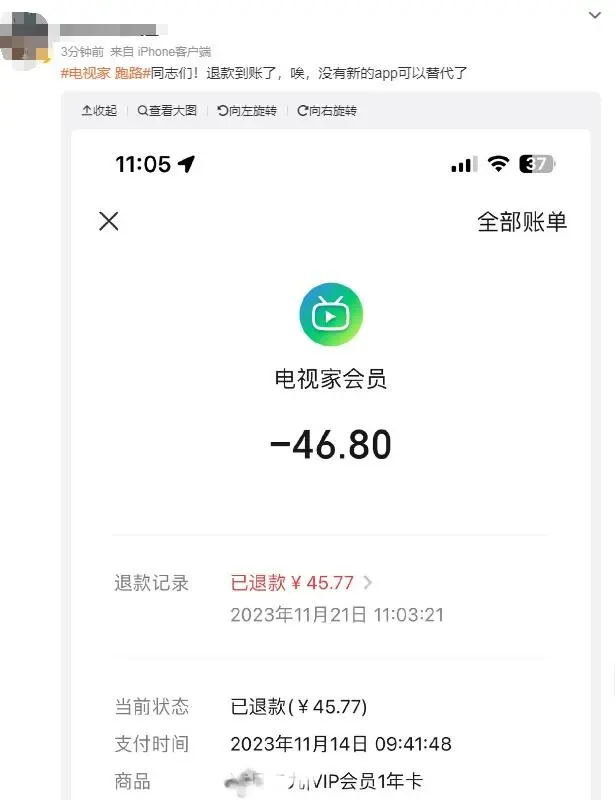 当天深夜,电视家助手发布公告,表示服务遇到问题,软件会妥善解决所有退款需求,绝对不会跑路。21日上午,陆续有多位用户反应已经收到了退款。