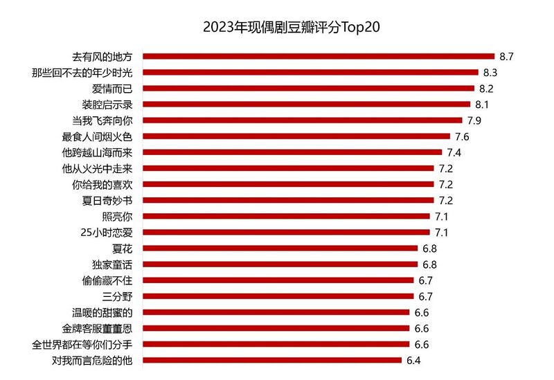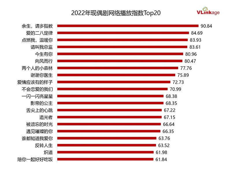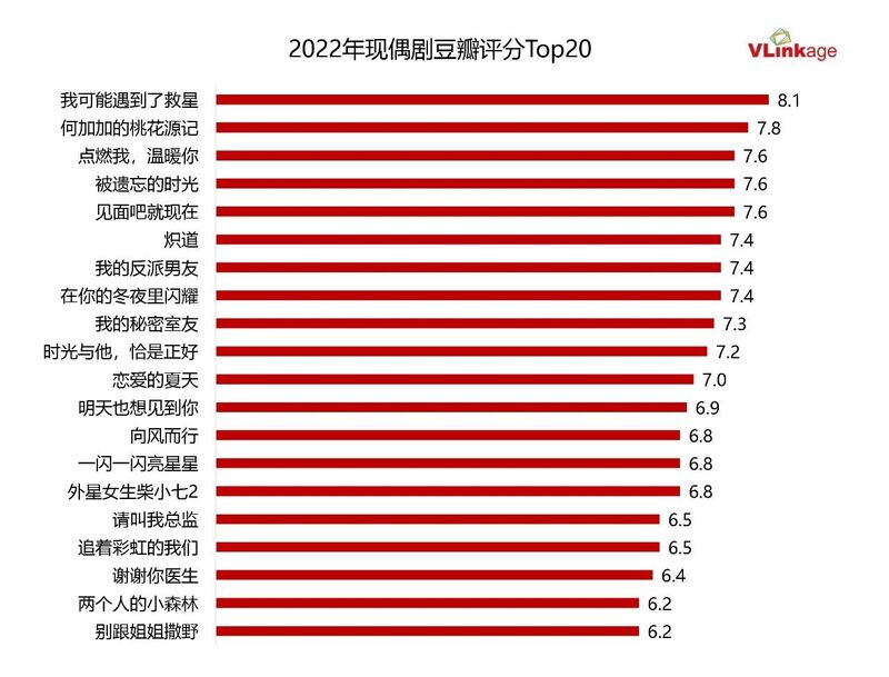 具体来看2022年现偶剧豆瓣评分Top20的作品。豆瓣评分在8分以上的仅有一部《我可能遇到了救星》,虽然这部在圈层受众里备受推崇的作品,网播指数仅有56.68,但该剧的主演曾舜晞和梁洁却收获了不俗的观众缘,如今双双资源飞升,受到头部剧集青睐。