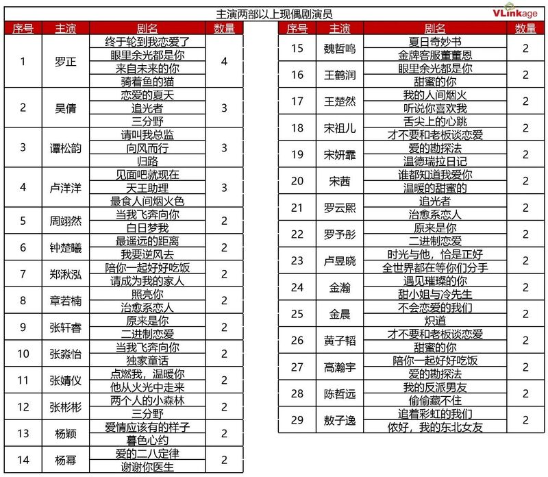 下图为近两年有多部现偶剧作品输出的演员盘点。数量最多的为演员罗正,2年有4部作品上线,但这些作品均为小成本剧,热度均在40+,其中3部受众太少豆瓣没有开分。