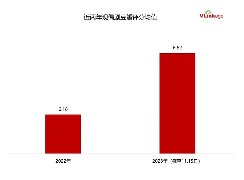 下图为近两年现偶剧整体口碑表现。如图所示,去年现偶剧口碑均值为6.18,今年截至11月15日豆瓣评分均值已经上涨至6.62分。