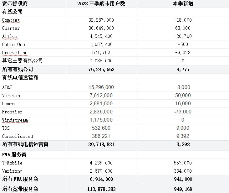 美国莱特曼研究集团(Leichtman Research Group,Inc)最新数据表明,美国主流的有线网络公司和有线电信运营商公司以及固定无线服务(FWA)服务商(就是移动运营商)在2023年第三季度年获得了约95万个新增宽带互联网用户,而在2022年第二季度预计将获得约85万名用户,同时上个季度的增量为84万。所以,总体而言,2023年第三季度宽带市场继续展现了持续增长态势。但各类宽带服务机构增减各异,并在业务层面有所体现。