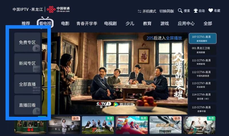 为兼顾不同用户的收视习惯和对点播节目内容的喜好,用户还可直接点击首页左侧“免费专区”“新闻专区”“全部直播”“直播回看”按钮,进入相应专区观看节目。