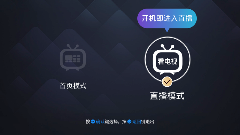 开机落焦页统一命名“看电视”,顶部设置“开机模式”选择按键,“直播模式”下,用户开机即进入中央电视台综合频道全屏直播,“首页模式”下,用户开机进入交互首页,20秒无操作自动进入全屏直播。