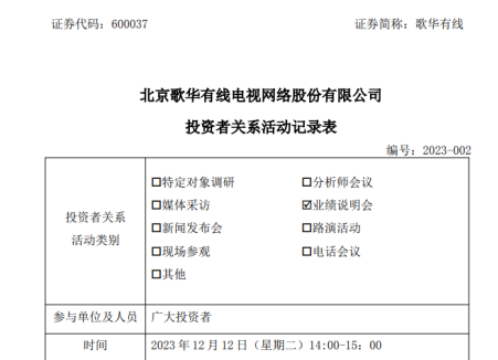 歌华有线:力争尽早彻底实现“全市一网”12月12日,北京歌华有线电视网络股份有限公司举行了2023年第三季度业绩说明会,并就相关问题作了答复。