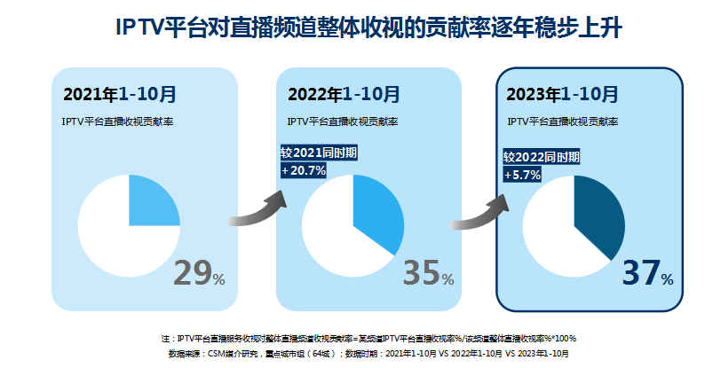 另据CSM基础研究数据显示,IPTV覆盖率已经达到52%,呈逐年上涨趋势。2023年1——10月,IPTV平台的市场份额较去年同期上涨5%,尤其是IPTV直播服务的市场份额较去年同期上升10%,IPTV对于整体直播收视的贡献率连续三年呈增长趋势,2023年贡献率达到37%,并且在观众结构上,中年观众以及大学及以上学历观众的比例也呈上升趋势。