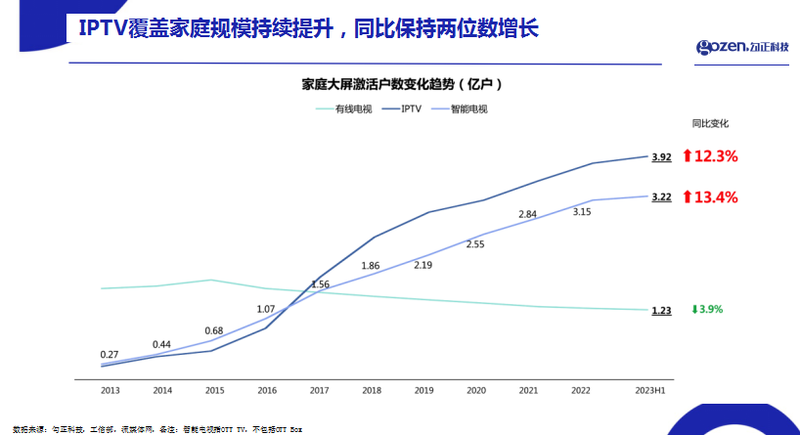 根据工信部发布的数据显示,IPTV用户规模呈现持续上涨的趋势,到2023年第三季度已经接近4亿用户。