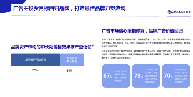 勾正科技高级副总裁姜岚在「春城论道」上表示,随着数据模型的完善,通过品牌资产带来的贡献已经占到整个销售额的70%,从而可以理解在优质媒体传播上,能够像户外大屏展示出品牌价值亮点的家庭智能大屏成为广告主的重要选择。尤其是经过过去几年市场不确定性洗礼,越来越多的广告主认识到,偏重“立竿见影”的效果广告而忽视品牌建设,无法带来可持续增长,品牌对消费者心智的影响需要长期积累,在效果广告流量见顶、成本高企的背景下,品牌广告迎来价值回归。