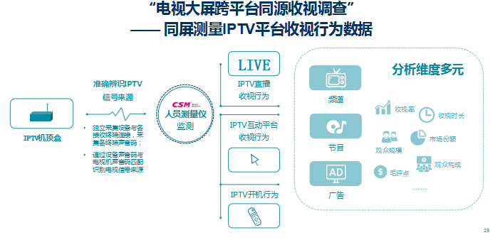 当然随着技术的进步,电视大屏的数据研究也在向前推进。中国广视索福瑞媒介研究(CSM)大屏与版权事业部经理黄婧玫在「春城论道」上表示,面对数字化时代的大屏收视生态变革,CSM推出了大屏跨平台收视产品。通过同源样本的调查数据,辅以技术手段的加持,可以获得受众分别通过智能电视、IPTV机顶盒、数字有线机顶盒等不同终端进行收视的行为数据。通过CSM的人员测量仪,可以获得到人的收视测量数据,通过精确的人员信息,了解不同TA属性人群的收视习惯及特点。同时,还可以通过数据对不同平台的频道、节目、广告收视情况进行分析,提供包括收视率、到达率、市场份额、观众结构等维度指标的分析。(相关文章:春城论道|CSM媒介研究黄婧玫:数字化时代重塑IPTV价值认知——2023年IPTV收视格局洞察)