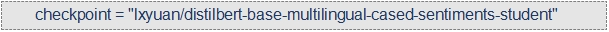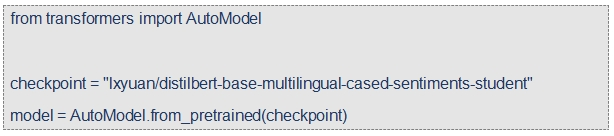 总之,这段代码的主要目的是通过指定的模型检查点,使用 AutoModel 类从 Hugging Face Model Hub 加载并实例化一个预训练的 Transformer 模型。在这个例子中,加载的是由用户 lxyuan 上传的、基于 DistilBERT 架构的、支持多语言的情感分析模型。