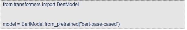在这个代码示例中,我们并没有使用 BertConfig,而是直接通过 bert-base-cased 这个标识符来加载了一个预训练模型。这个模型检查点是由 BERT 的原作者们所训练的,关于这个模型更多的详细信息和特性,你可以访问模型卡片来了解。