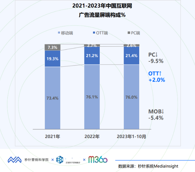 不妨以大屏行业为例。在移动互联网流量见顶的当下,OTT是为数不多仍在高速增长的流量入口,大屏端的潜力正越来越受到影视行业的重视。根据《2024中国数字营销趋势报告》,OTT在中国互联网广告流量屏端构成占比持续上升,已达21.4%。