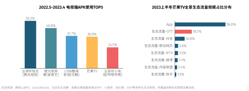 根据群邑智库《2023中国媒介概览·金秋版——路漫且灿 笃行致远》数据显示,电视端APK使用前五均为在线视频平台,内容版权优势成为它们纷纷布局OTT的主要支撑。同时,在2023年上半年芒果TV全景生态流量规模占比分布中可以看到,OTT流量已达到18.7%,位居第二。
