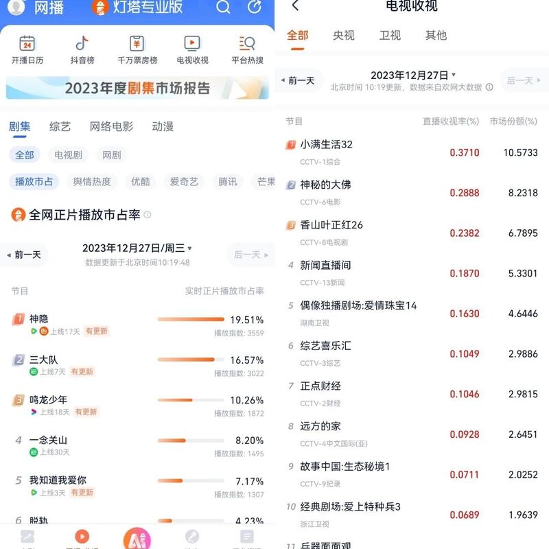 大屏数据维度的补足,究竟能够为市场带来怎样的新洞察?我们或许能够从灯塔专业版刚刚发布的《2023年度剧集市场报告》一窥究竟。报告分别从市场表现、题材类型、平台表现、营销策略等角度对2023全年剧集市场进行深入的分析和总结,其中,欢网大数据为其提供电视直播收视数据支持。