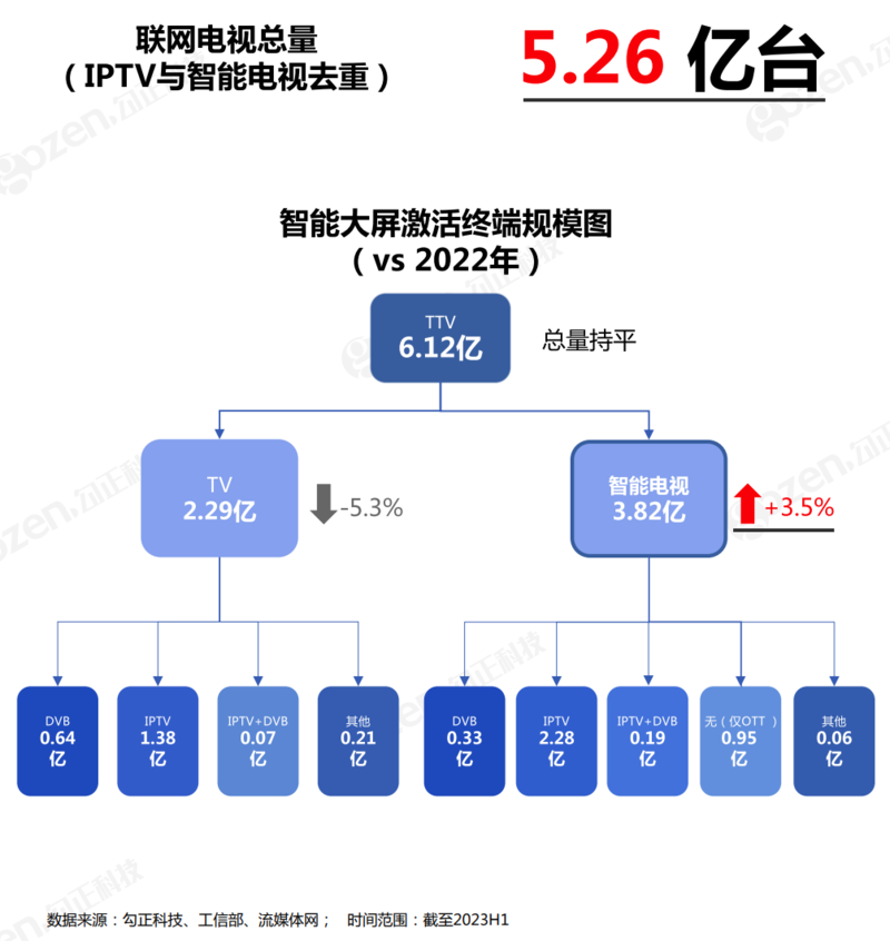 首先,我们必须意识到大屏如今已经聚集和积累了庞大的用户数量。勾正科技《坦途前行:2022中国智慧屏行业发展白皮书》显示,截止到2023H1,联网电视总量(IPTV与智能电视去重)为5.26亿台。且从内部结构看,智能电视所占比重依然处于持续上升的通道。