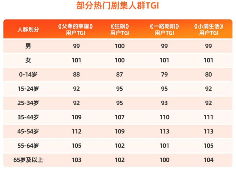 结合热门剧集人群TGI,我们能够更直观地感受到央视出品的全民属性。不难发现,《父辈的荣耀》《狂飙》《一路朝阳》《小满生活》在各年龄段结构分布非常均衡。某种程度上这也契合了不断壮大的大屏用户群特点:作为家庭,用户朝大屏的回归体现于各个年龄层。
