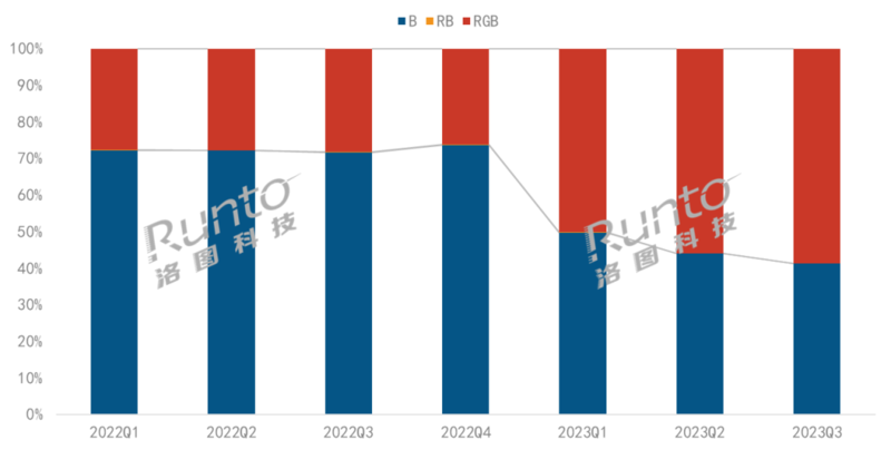 根据洛图科技(RUNTO)数据显示,2023年前三季度,中国激光投影市场中三色技术市场份额达到37.6%,较2022年同期大涨20.3个百分点;而在家用市场,三色已经实现了对单色的反超,出货量占比达到55.3%。
