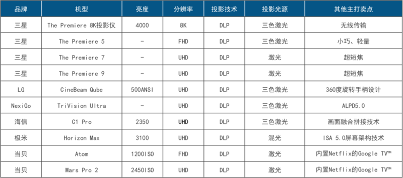 4K加速普及,8K蓄势待发。三星、LG和当贝均推出了4K UHD分辨率的激光投影产品,4K已经成为主流品牌旗舰产品的标配;此外,既海信推出8K激光电视后,三星也推出了8K的激光投影仪。更高清,是产品确定性的发展方向。