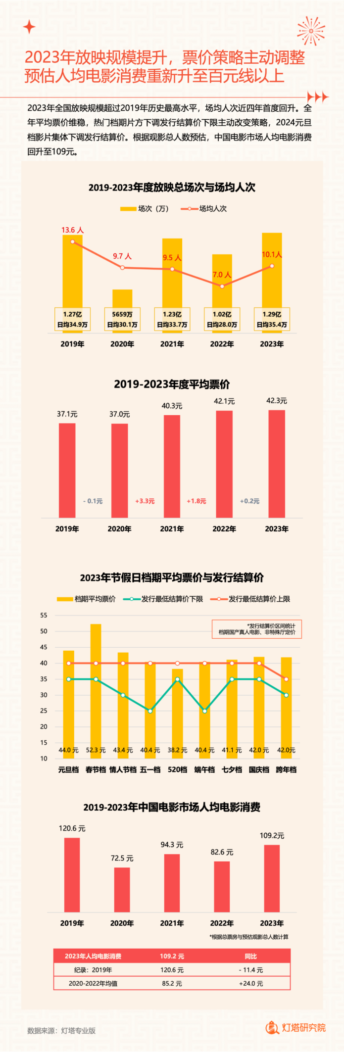 灯塔研究院联合新华网发布的《2023中国电影市场年度盘点报告》显示,2023年票房相比过去三年大幅上涨七成、恢复至2017年水平,人次上涨六成,人均观影频次升至2.58次,预估全年城市院线观影总人数再度突破5亿大关。这也与票价的调整有关。