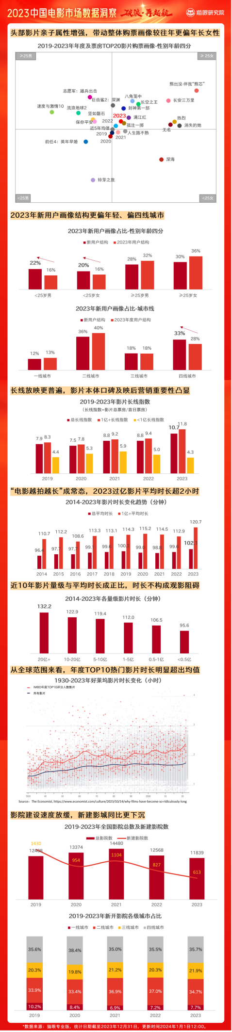 灯塔报告显示,相比2020-2022年,中高频观影用户均有显著提升,相比2019年更多平时较少观影的低频用户走进电影院。用户画像显示,2023年女性观众占比攀升至58%,女性及成熟女性观影需求逐渐主导市场。下沉市场观影人次继续保持40%以上,三四线城市年票房双双突破100亿。猫眼报告显示新用户更年轻化,偏四线。