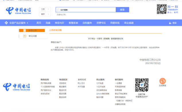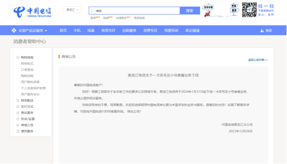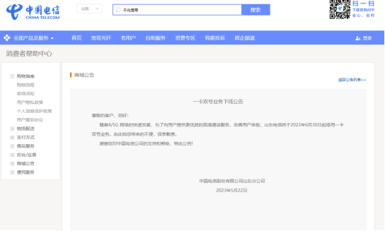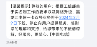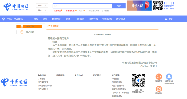 有消费者在网上爆料,自己收到中国电信短信通知,自己已经用了9年的“一卡双号”业务即将下线,引发广泛关注。