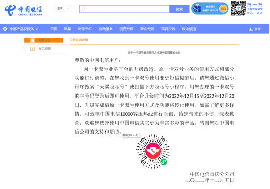 从上面各个省份发出的公告可以看出:1)电信“一卡双号”业务在多省下线已成事实;2)该业务各省下线时间并不一致,最早2022年年底就已经下线,而最晚的黑龙江是到2024年1月31日;3)关于下线原因,有指出是防诈骗(实名制),也有说是平台升级,适应4G/5G发展需求提供高清通话服务。