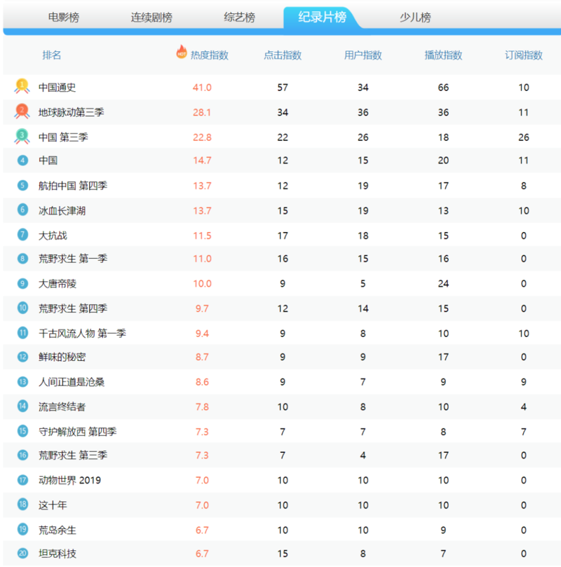 ▶ 历史纪录片《中国通史》再次登顶纪录片榜榜首,热度指数最高达到41。