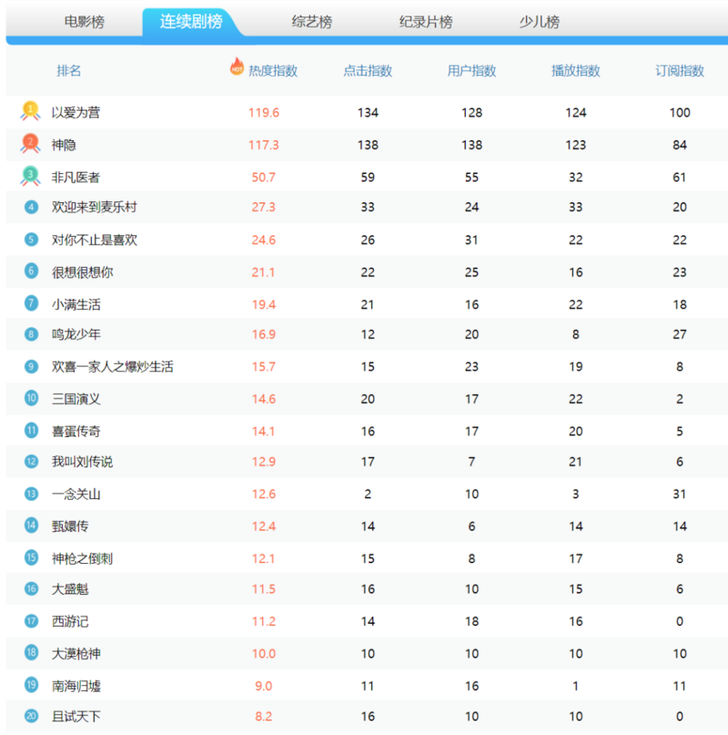 ▶ 都市言情剧《以爱为营》连续两个月占据连续剧榜榜首,热度指数连续破百高达119.6。