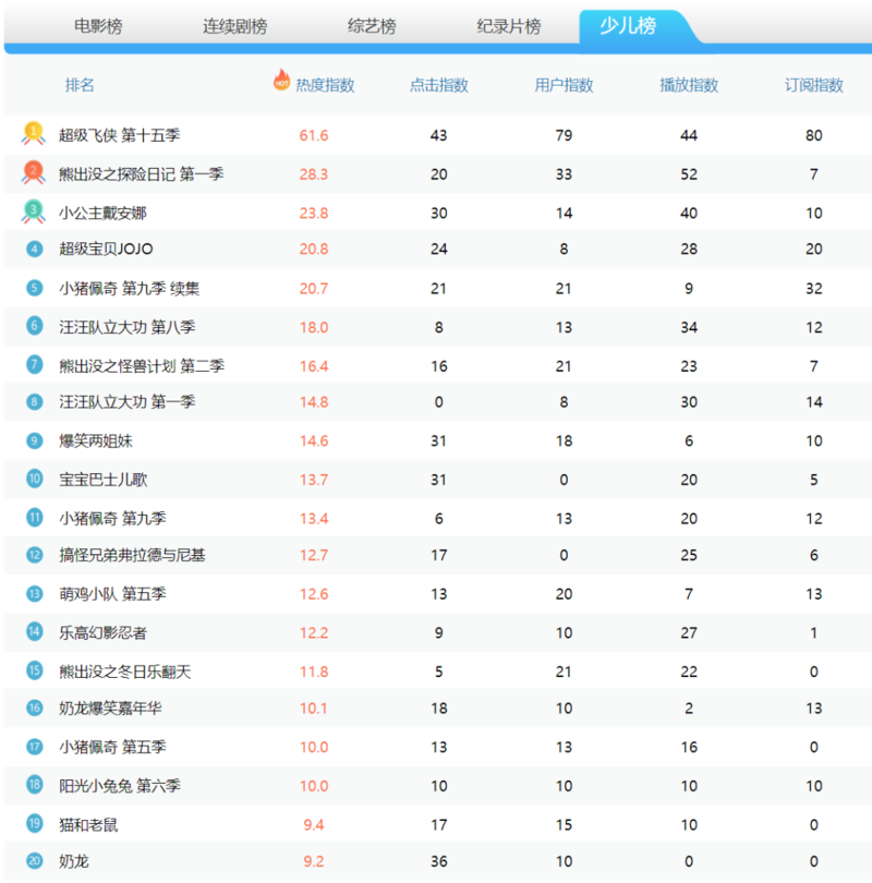 ▶ 新一季《超级飞侠 第十五季》火热登场,霸占12月少儿榜榜首,订阅指数高达80。