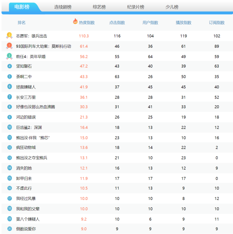 2、点击指数、用户指数、播放指数、订阅指数由各省级IPTV平台影片点击、播放、订阅等数据综合加权得出。