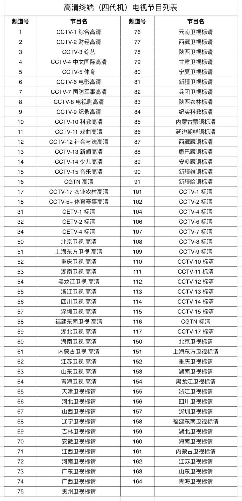 卫星直播“户户通”高清终端(四代机)电视节目列表