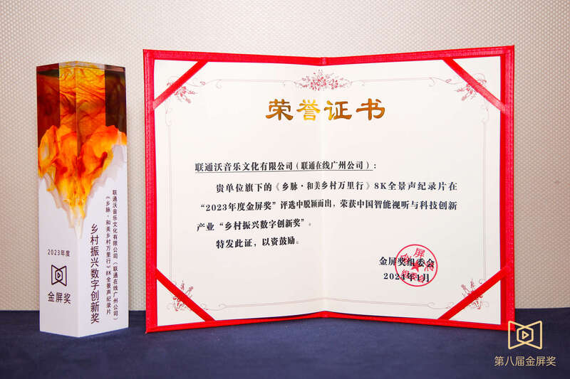 在本次颁奖盛典上,联通沃音乐文化有限公司(联通在线广州公司)-《乡脉·和美乡村万里行》8K全景声纪录片荣获产品类奖项中乡村振兴数字创新奖。