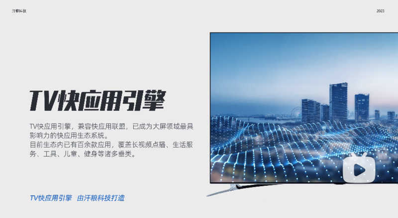 TV快应用引擎由汗粮科技打造,兼容快应用联盟,已成为大屏领域最具影响力的快应用生态系统。目前生态内已有百余款应用,覆盖长视频点播、 生活服务、工具、儿童、健身等诸多垂类。
