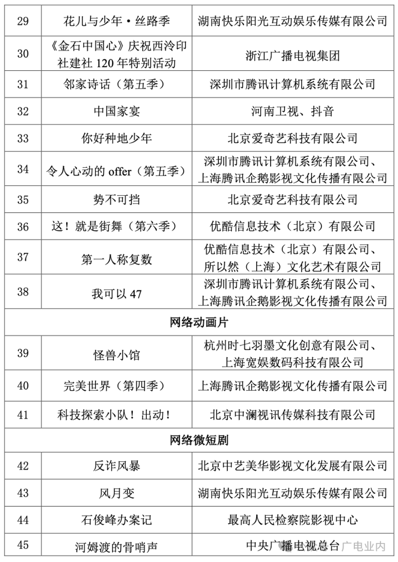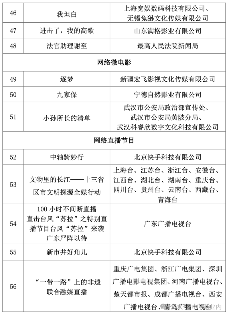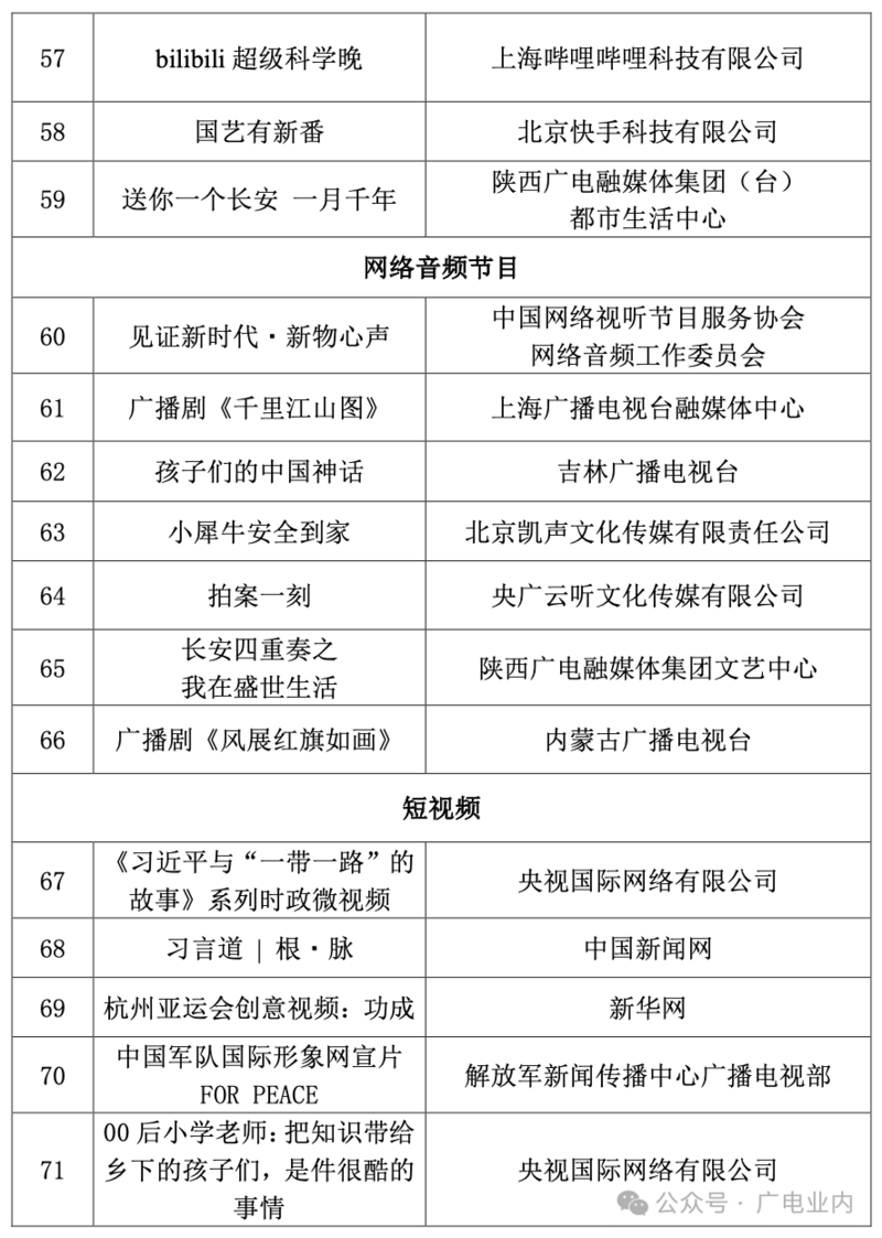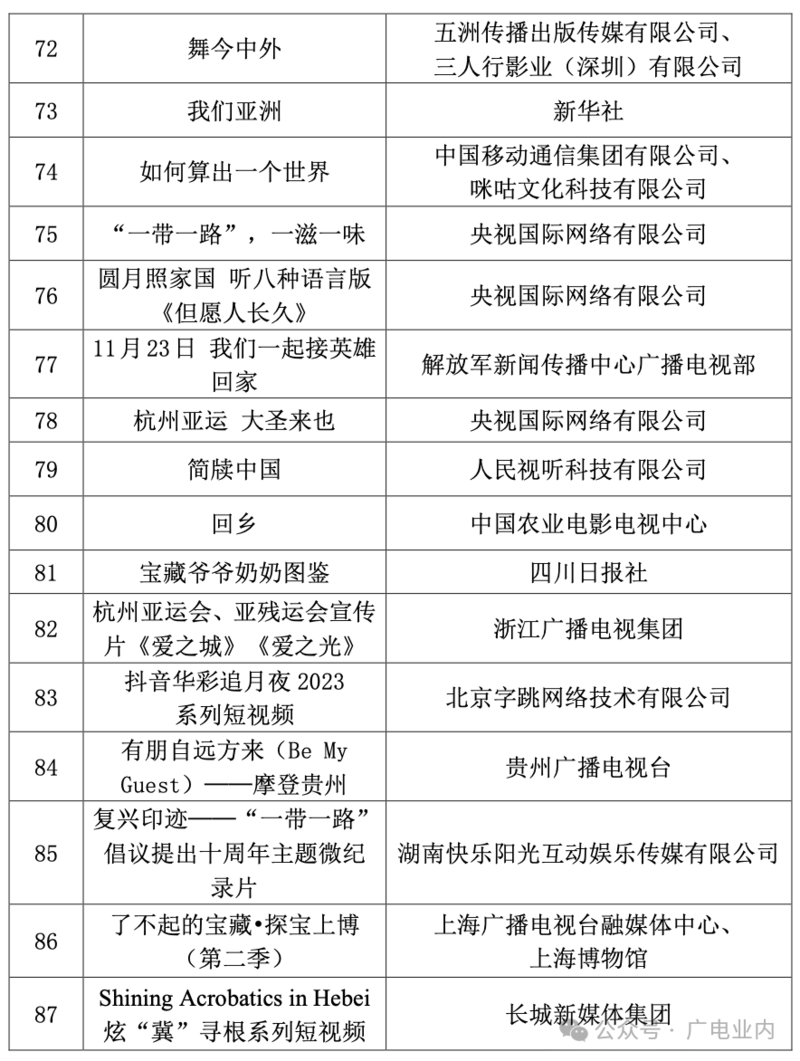 经省级广电行政部门和中央直属单位等推荐,专家评审委员会审核,最终确定了87部入选作品,现将结果予以公布,同时可在国家广播电视总局政府网站(网址:http://www.nrta.gov.cn)公告公示区中查询。