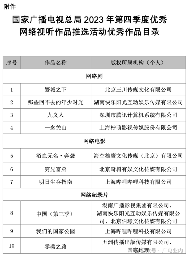 为深入学习贯彻习近平文化思想,深入贯彻落实全国宣传思想文化工作会议、全国宣传部长会议和全国广播电视工作会议精神,进一步丰富优质网络视听内容供给,发挥精品节目示范引领作用,营造良好创作传播生态,国家广播电视总局近期组织开展了2023年第四季度优秀网络视听作品推选活动。