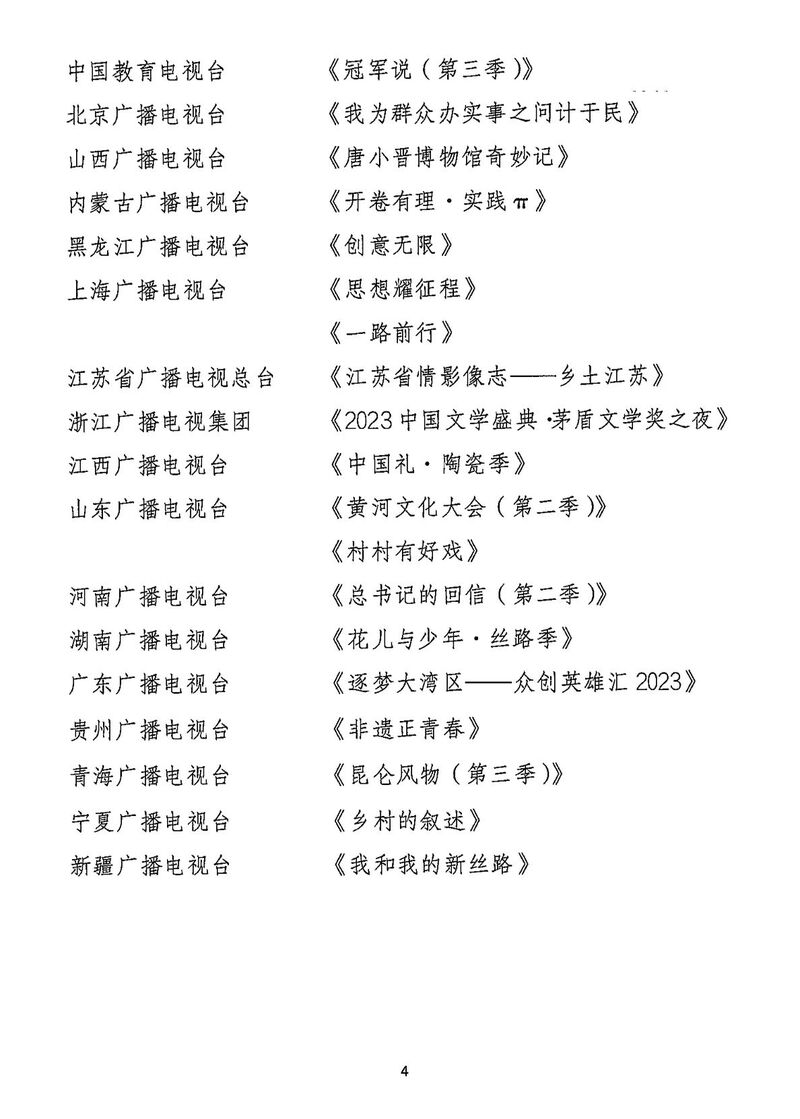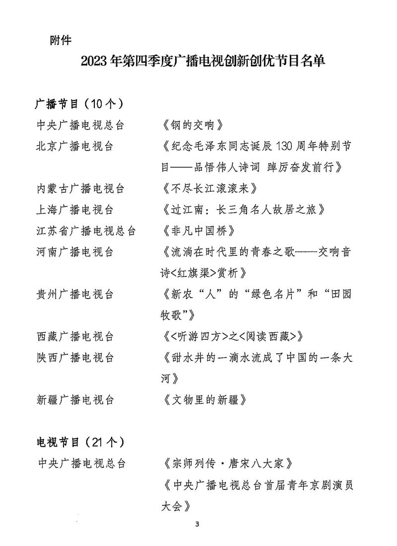 3月20日,由广电总局评选的《2023年第四季度广播电视创新创优节目》名单出炉,10个广播节目、21个电视节目入选。