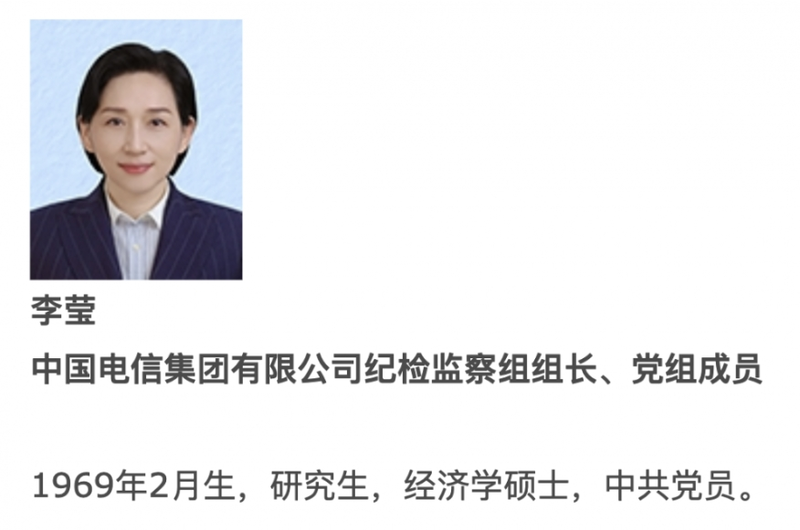 从中国电信官网获悉,李莹任中国电信集团有限公司纪检监察组组长、党组成员。