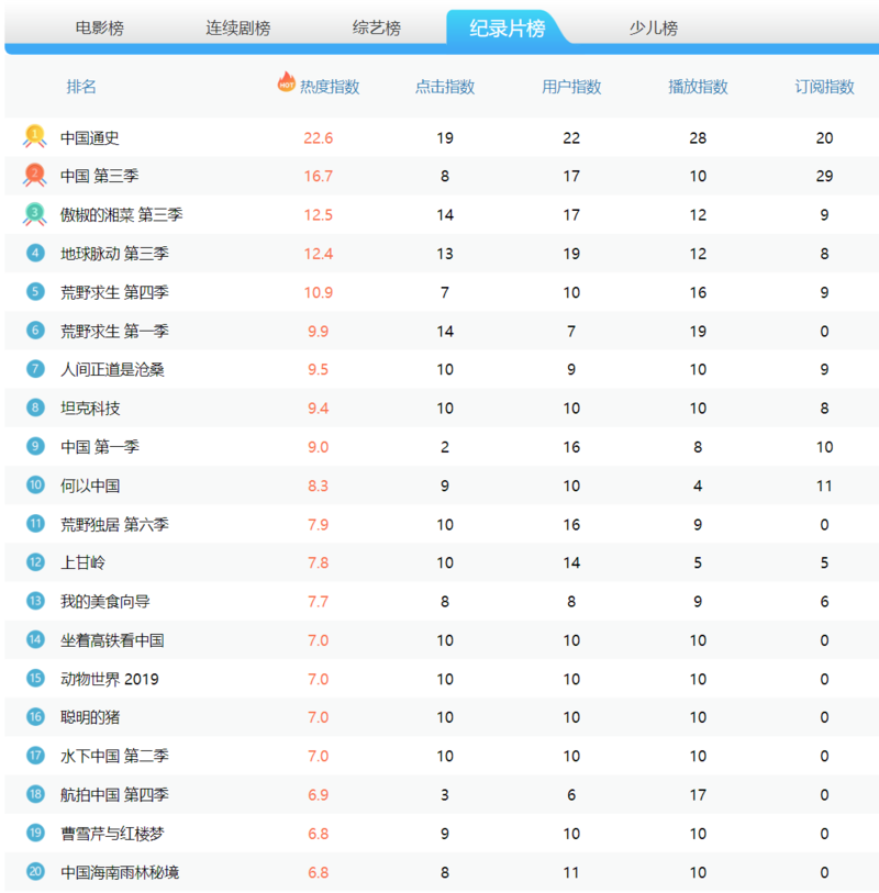 ▶ 大型历史纪录片《中国通史》已连续四个月登顶纪录片榜榜首,点击、用户和播放指数均为最高。