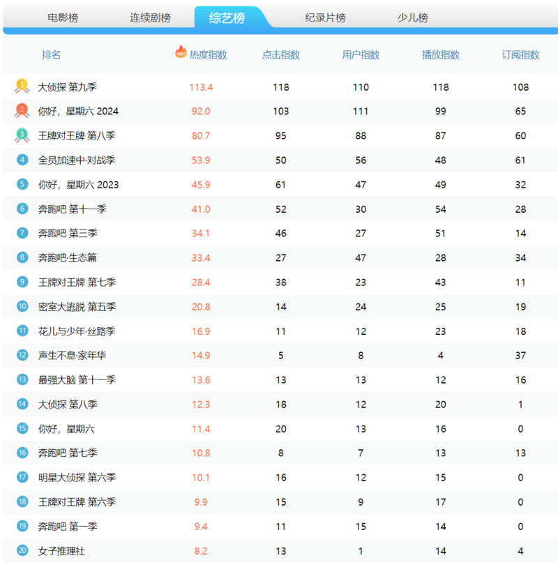 ▶ 明星推理真人秀《大侦探 第九季》以113.4的热度指数登顶综艺榜榜首,点击、用户、播放和订阅指数均为最高。