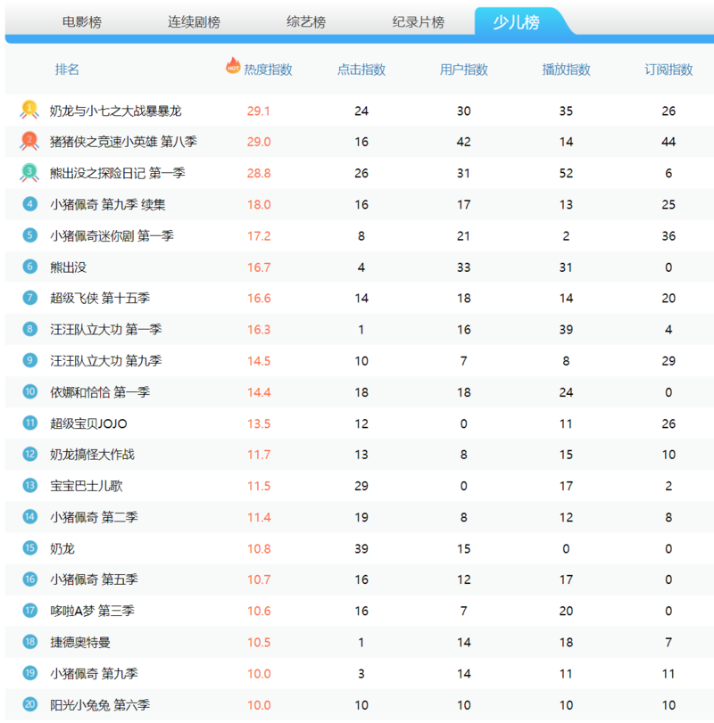 ▶ 动画片长尾效应显著,《熊出没之探险日记 第一季》已连续七个月占据少儿榜前三名。
