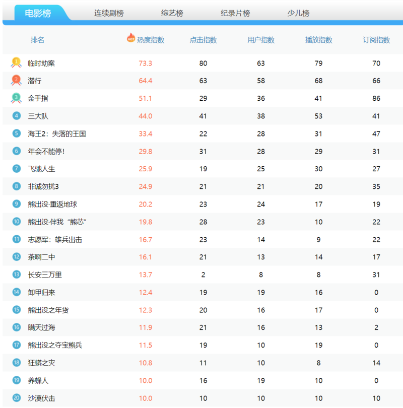 ▶ 动作犯罪片《临时劫案》和《潜行》分别以73.3和64.4的热度指数拿下电影榜第一和第二名。