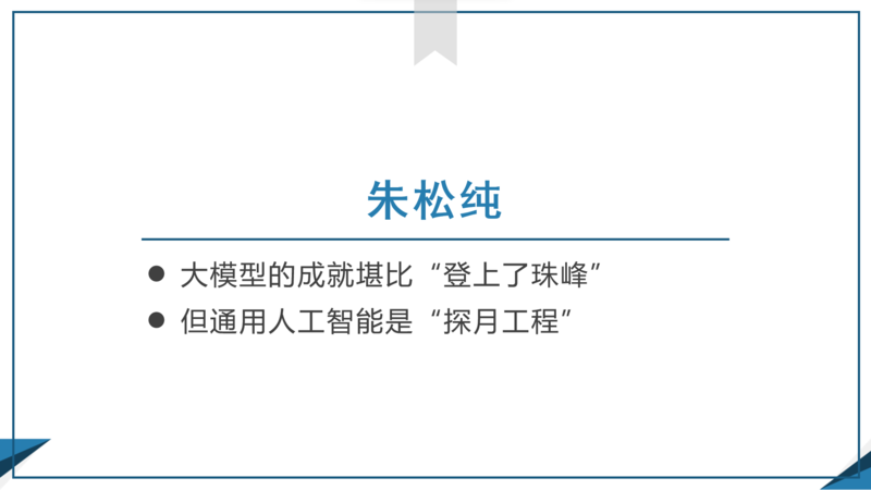 朱松纯认为,大模型的成就堪比“登上了珠峰”,但通用人工智能是“探月工程”。攀登珠穆朗玛峰相对容易,但探月工程的复杂性要高得多。他将生成式人工智能研究比喻为“鹦鹉式”,而他的目标是实现“乌鸦式”的人工智能。这意味着即使在数据量有限的情况下,人工智能也应具备目标设定、行动执行、感知和认知能力。在此基础上发展起来的人工智能可能会成为我们未来发展的主要方向。