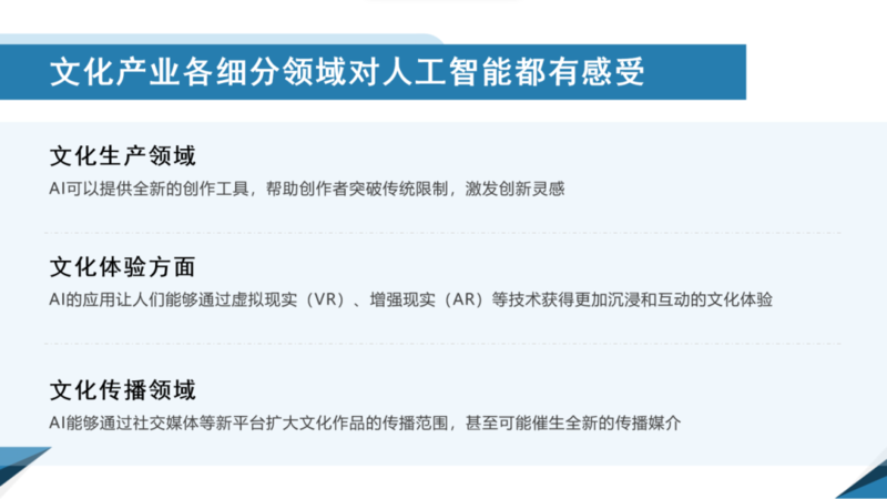 文化产业各细分领域对人工智能都有感受。在文化生产领域,人工智能提供了全新的创作工具,助力创作者打破传统局限;在文化体验方面,借助虚拟现实和增强现实等技术,用户可以享受到更加沉浸和互动的文化体验;在文化传播领域,AI利用社交媒体等新兴平台扩大文化作品的传播范围,甚至可能催生全新的传播方式。