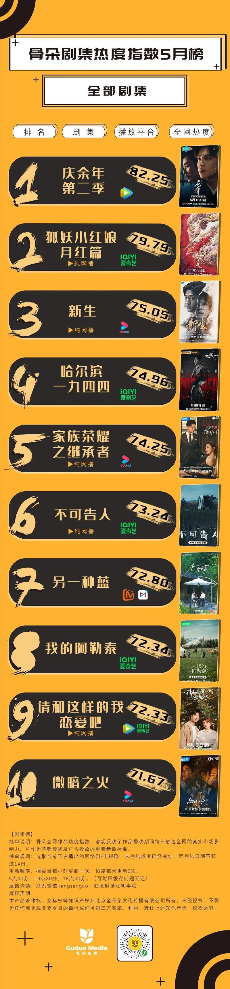 本月剧集市场热闹非凡,多部上新作品热度表现良好。在5月的骨朵剧集月榜榜单中,《庆余年第二季》荣登榜首,其骨朵热度高达82.25。这部剧从筹备开始就备受期待。演员阵容强大,包括张若昀、陈道明、李小冉等众多实力演员。目前,该剧已经会员收官,收获了极高的口碑和热度。