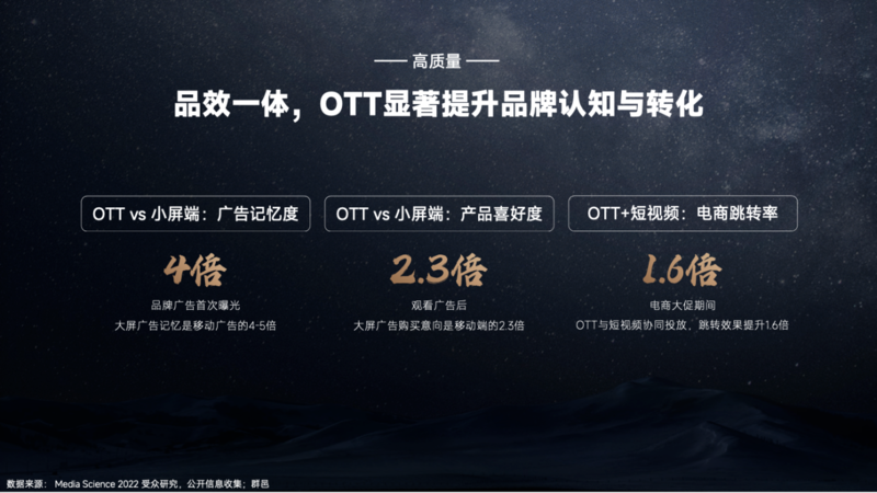 因此,对于广告主来说,选择投放OTT大屏无疑是一个极具质价比的选择。仅能够精准触达目标受众,提升品牌认知度和公信力,还能够有效驱动消费行为转化,为品牌创造更大的商业价值。