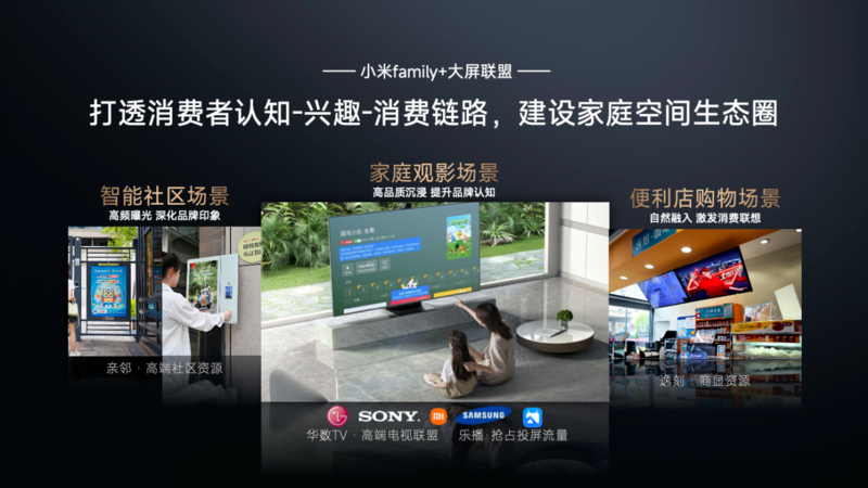 优质的媒介只有通过深度协同才能更好地实现价值的最大化。从打透消费者认知,到建立消费兴趣,再到无缝串联整个消费链路,小米商业营销率先建立了以家庭观影场景、智能社区场景、便利店购物场景为支柱的“家庭空间生态圈”。为消费者带来了更丰富的体验,更为品牌提供了以消费者为核心的全方位、多角度的品牌渗透服务。