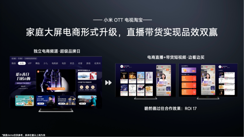 小米OTT顺应消费者趋势,携手电视淘宝为行业带来“品效销一体”的营销产品——家庭大屏电商,基于一键到店功能,创新地融合「直播+短视频」形式,实现品牌曝光与用户深度吸引的双重效果。