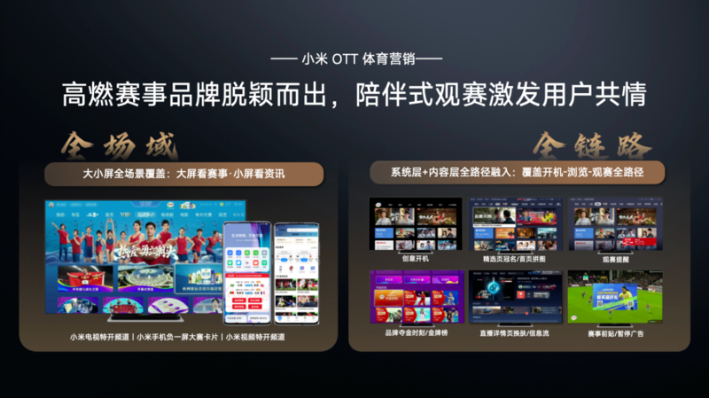 节点是天然的流量放大器,更容易触发消费者情感,激活消费意愿。而在众多媒介当中,OTT大屏则成为品牌流量与品质的放大器。以全场域、全链路为高燃赛事品牌激发消费者共情。