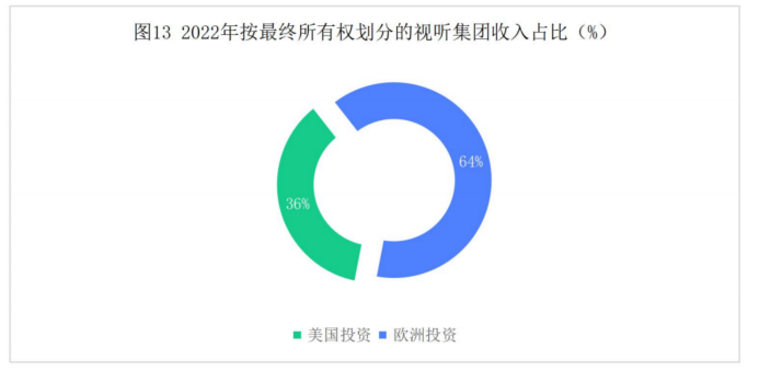 在排名前100的视听传媒机构中,私营媒体收入的一半来自美国传媒集团。美国广播电视公司往往通过在欧洲本地化频道的运营,实现在欧洲更大范围的传播。但在观众数量方面,欧洲本土电视台仍处于领先地位。纯SVOD平台,如奈飞(Netflix)、亚马逊Prime video、DAZN和苹果电视(Apple TV+),占前100名收入增长的40%,推动2022年OTT收入比2016年增长了6倍。2022年,美国投资并支持的传媒集团,收入比2016年增长了46%,占欧洲私营机构收入增长的三分之二。