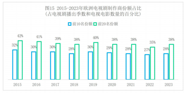欧洲传媒机构通过收购、合并和联盟方式加快整合,但并没有提高市场的集中度,头部传媒机构产量增速低于整个市场的平均增速,排名前10和前20的制作机构,市场份额自2015年以来就进入下降通道。